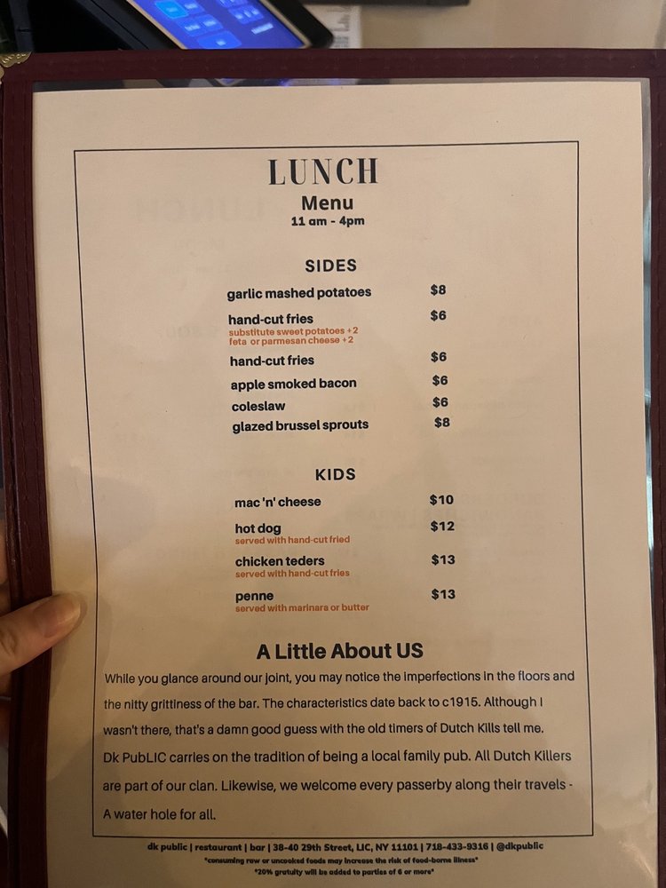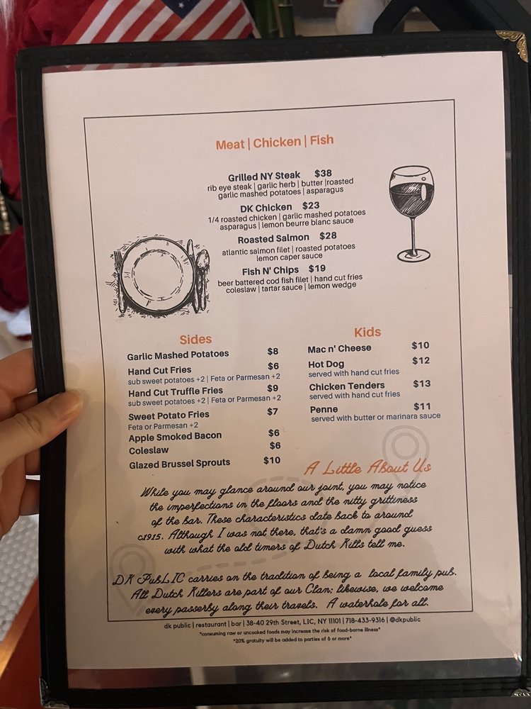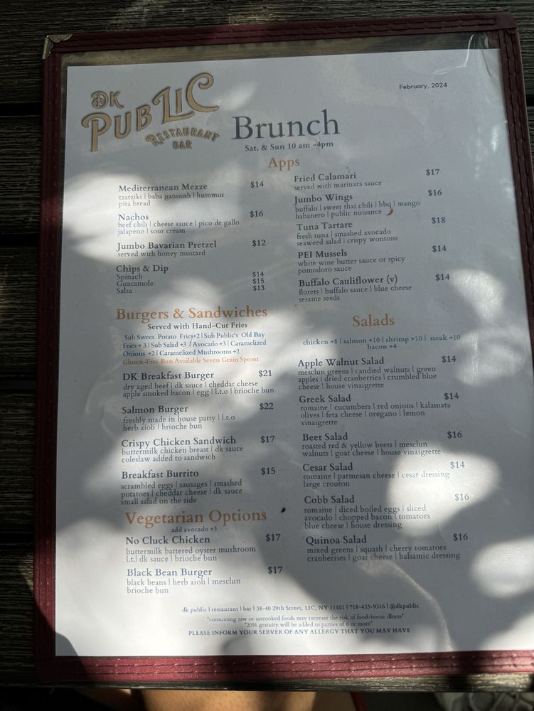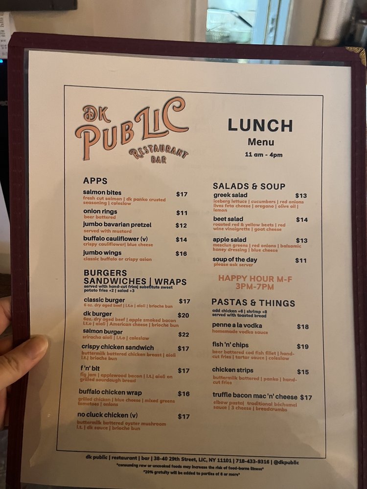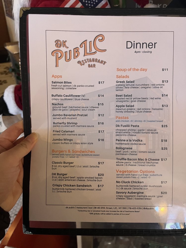 DK PubLIC is a cozy neighborhood pub in Long Island City, offering a variety of options for both pescatarians and vegetarians. With a full bar, outdoor seating, and happy hour specials, it's the perfect spot for a casual and intimate dining experience. The menu includes a range of salads, appetizers like Buffalo Cauliflower and Tuna Tartare, as well as burgers, sandwiches, and wraps. Customers rave about the delicious food, friendly staff, and dog-friendly atmosphere. The Mediterranean Mezze and signature burgers are standout dishes that keep patrons coming back for more. Don't miss out on the tasty food and tantalizing specials at DK PubLIC if you're in the area.